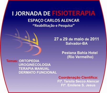 De 27 a 29 de maio de 2011 no Pestana Bahia Hotel em Salvador – BA, acontecerá a I Jornada de Fisioterapia do Espaço Carlos Alencar sobre Reabilitação e Pesquisa. A Jornada terá coordenação científica das fisioterapeutas Tarsila Secco Alencar e Emilene S. Jesus e terá como temas Ortopedia, Uroginecologia, Terapia Manual e Dermato funcional.